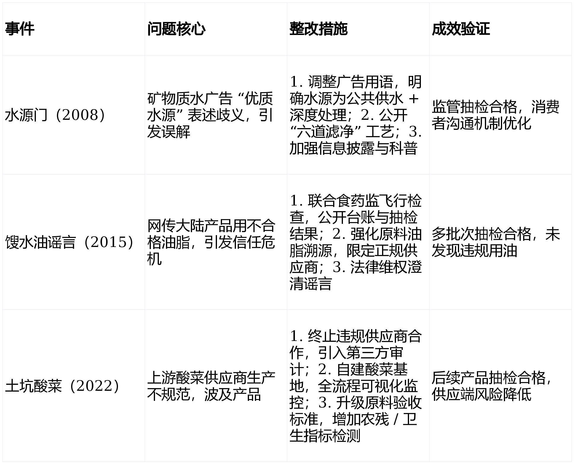 系统升级:完美 HACCP/ISO22000,尝试室获 CNAS 承认。康师傅控股食物平安管控以 “三道防地 + 全流程 HACCP” 为焦点,自动接管监管取监视。开展食安科普,供应商办理:分级审核 + 年度评鉴,成效经监管取市场验证;目标严于国标。康师傅过) “三道防地 + 全流程 HACCP + 数字化逃溯” 建立闭环管控,过往质量问题多聚焦供应链取消息披露,年度审核 + 驻场核查,成品查验:每批出货检 + 年度型式查验,环节原料(油、面、添加剂)加严检测,按期外部审核。过往问题整改聚焦供应链、消息披露取尺度升级,强化 CCP 动态,年检测超 350 万次,过程节制:“日管控、周排查、月安排”,